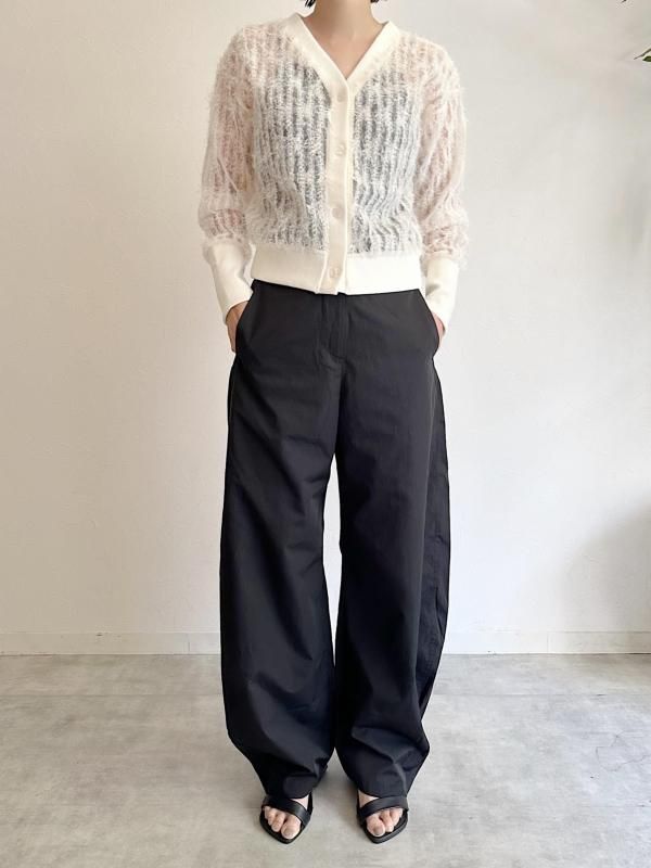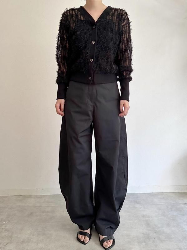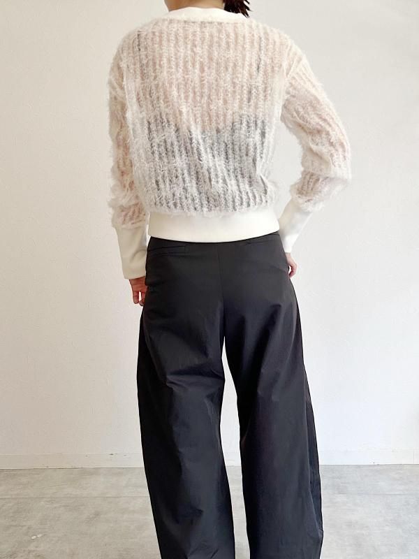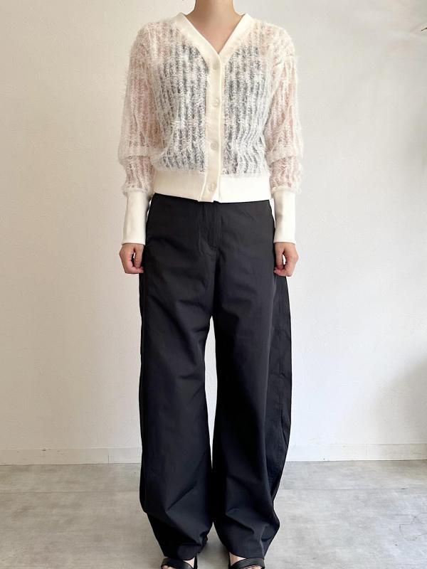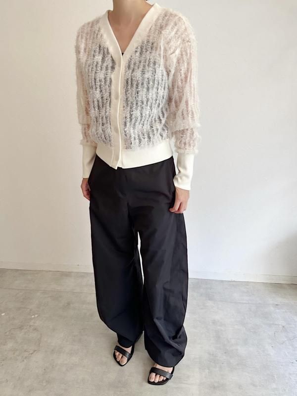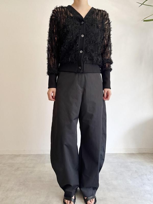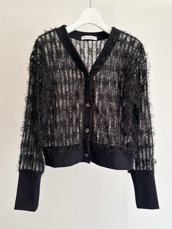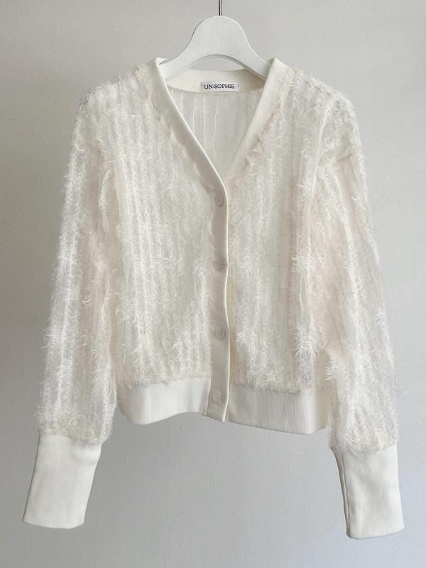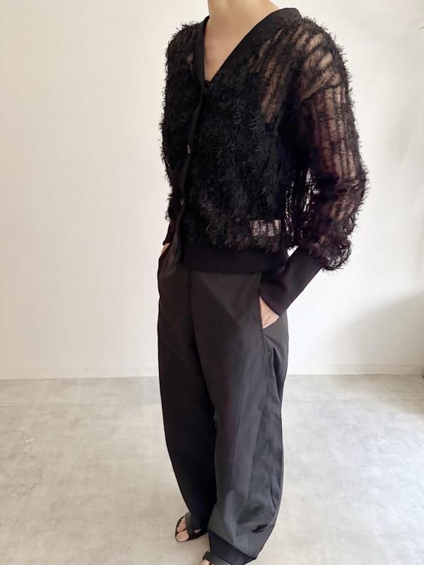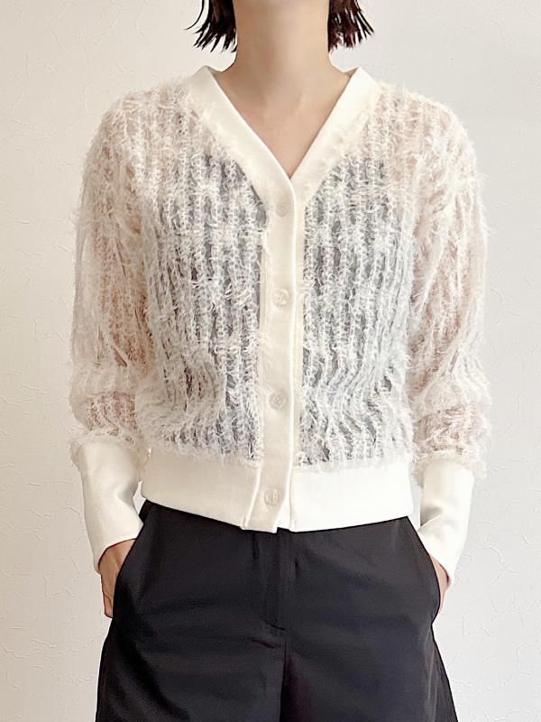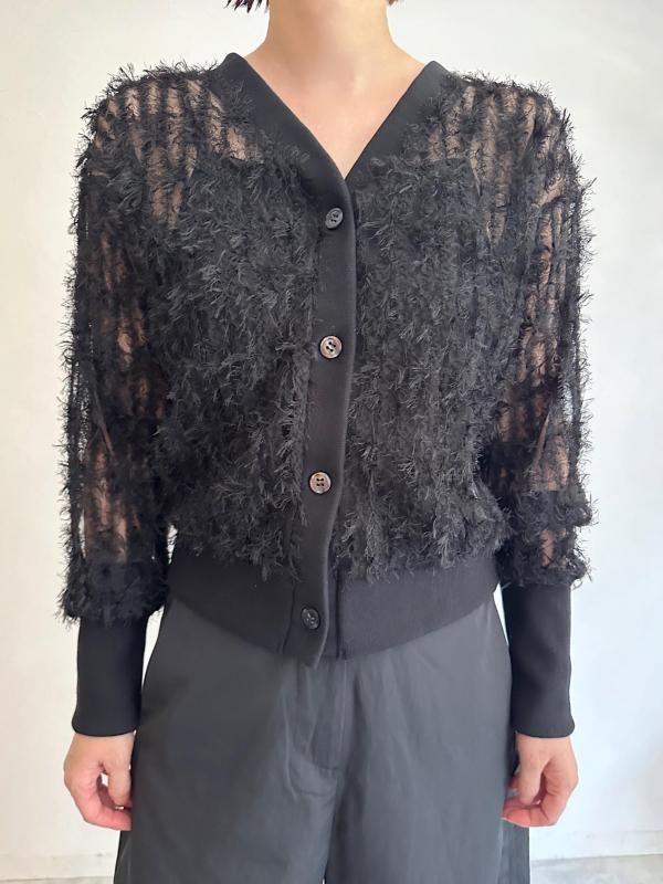 フェザーとチュールがドッキングした上質な日本製の生地を使用したカーディガン。